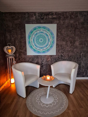 In meinem Malatelier kann ich mich voll meinen Bildern, Mandalas und sonstigen Projekten widmen. Besonders schön ist es immer, in meinen diversen Kursen liebe Leute kreativ zu begleiten.
